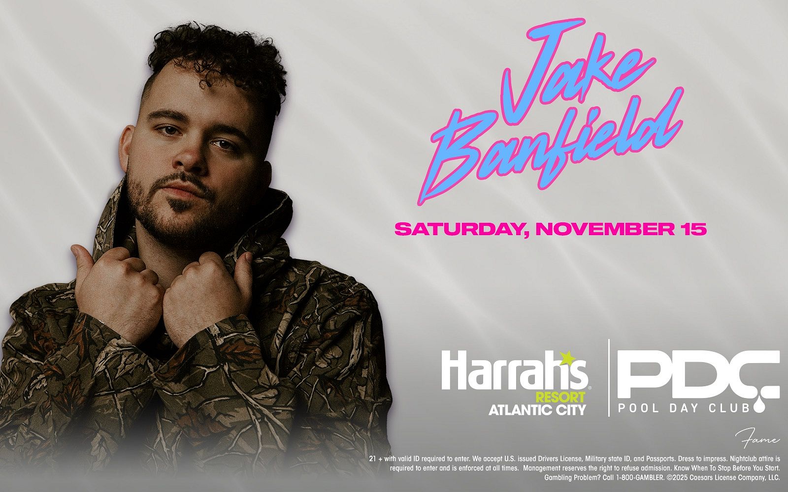 On Saturday daytime, The Pool Day Club at Harrah's Resort Atlantic City invites you to a vibrant day party with a performance by JAKE BANFIELD! Join us for an unforgettable pool party experience at Harrah's Resort, where the sun, beats, and good vibes collide.
